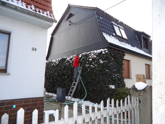 In einem Doppelhaus in Dessau sollen die Außenwände nachträglich durch eine Hohlwanddämmung gedämmt werden.